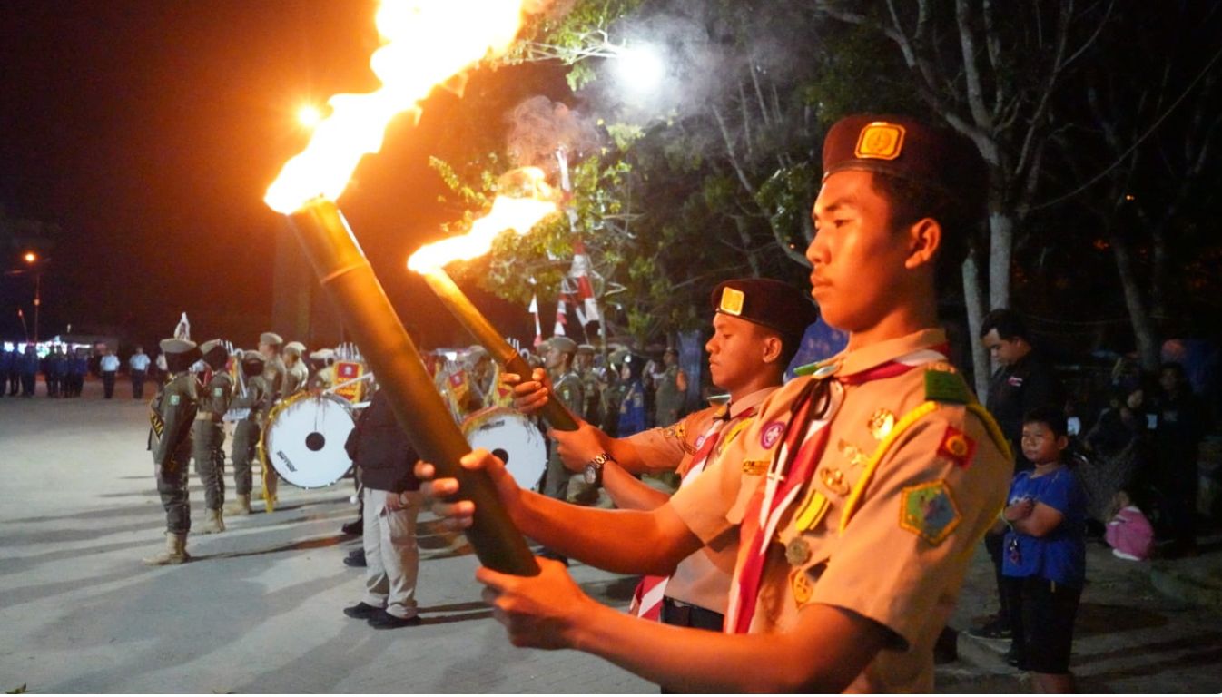 Suarkalsel, Tanah Bumbu – Upacara Taptu dan Pawai Obor dalam rangka memperingati HUT ke-80 Kemerdekaan Republik Indonesia digelar di Panggung Utama Pantai Pagatan, Kecamatan Kusan Hilir, Sabtu malam (16/8/2025).